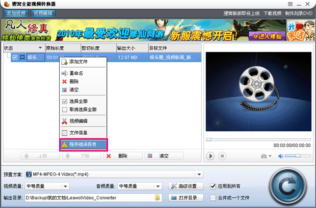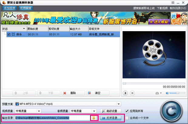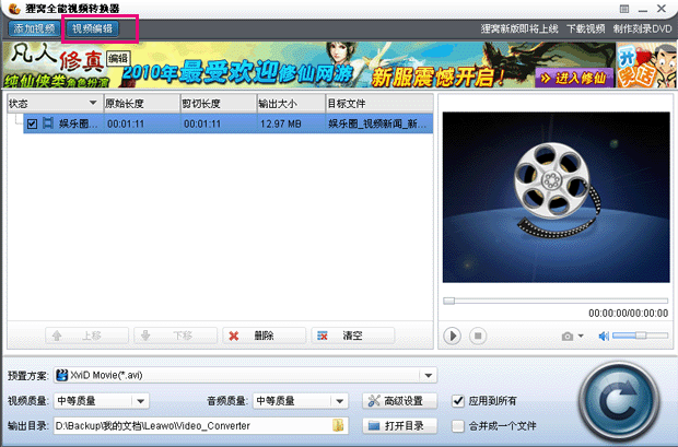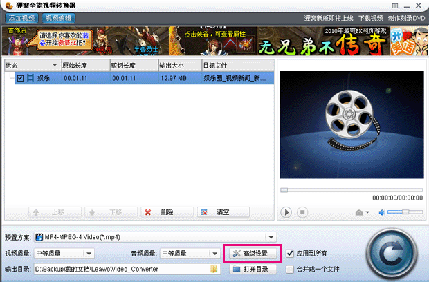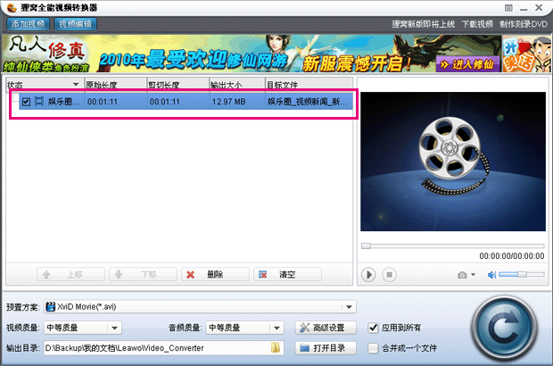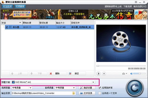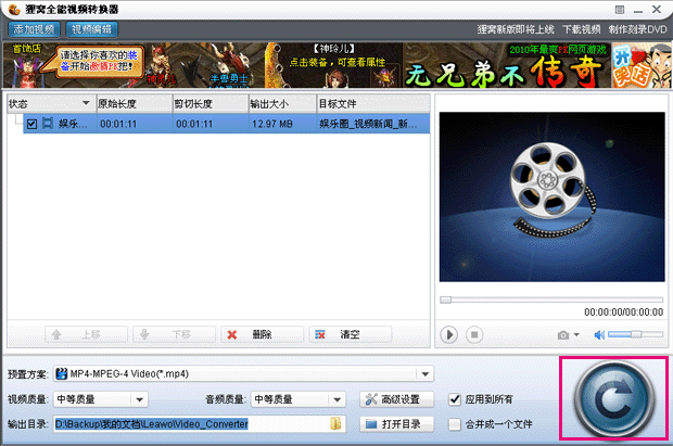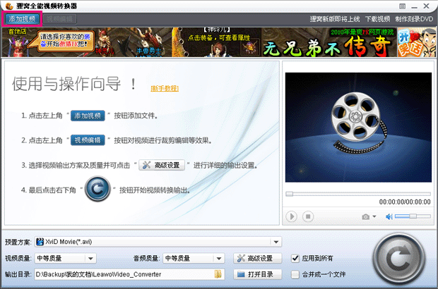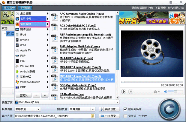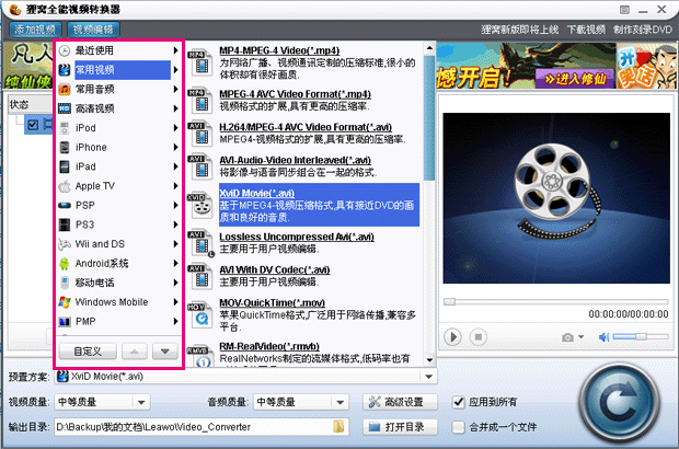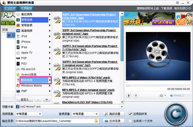 先來看看新版操作使用教程吧。首先運行軟件界面如下圖所示:(注:新版界面實際規格為844x556) 1:添加視頻文件:   2:視頻編輯:  3:選擇輸出格式:     4:參數設置:  (為什么轉換后放在手機上播放不了,提示非法格式,就是因為你轉換的時候設置的視頻編碼器與你的手機支持的編碼器不一樣,詳情參考:再也不會出現轉換后手機播放不了,也不會出現非法格式了。 )    附:設置輸出路徑,一般默認為 我的文檔LeawoVideo_Converter                      (注:為什么轉換后找不到文件了,有可能是因為你添加的視頻文件名含有怪異字符,建議去掉或者替換為英文字母即可。) 5:開始轉換:   如果在轉換過程中遇到問題,請進行下例操作: