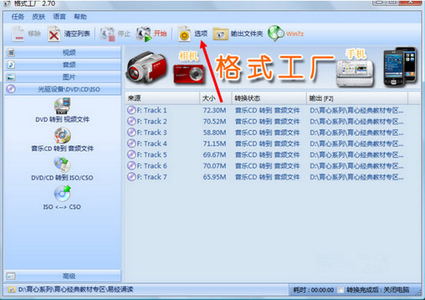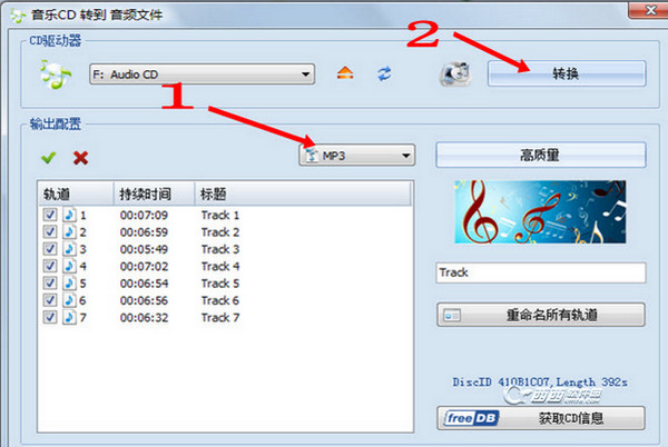 第三步:出現下圖界面后,可能文件進行選擇,一般轉換整張光盤無需選擇,但要注意輸出配置里要選成MP3。然后點右上角的轉換按鈕。