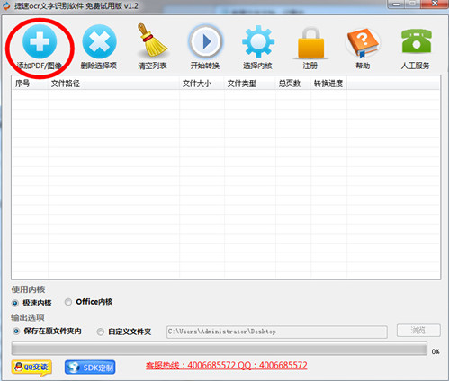 1、打開下載好的軟件,直接進(jìn)入操作主界面,點(diǎn)擊上方左起第一個(gè)“添加文件”按鈕,將需要識別的文件按提示添加到軟件中。