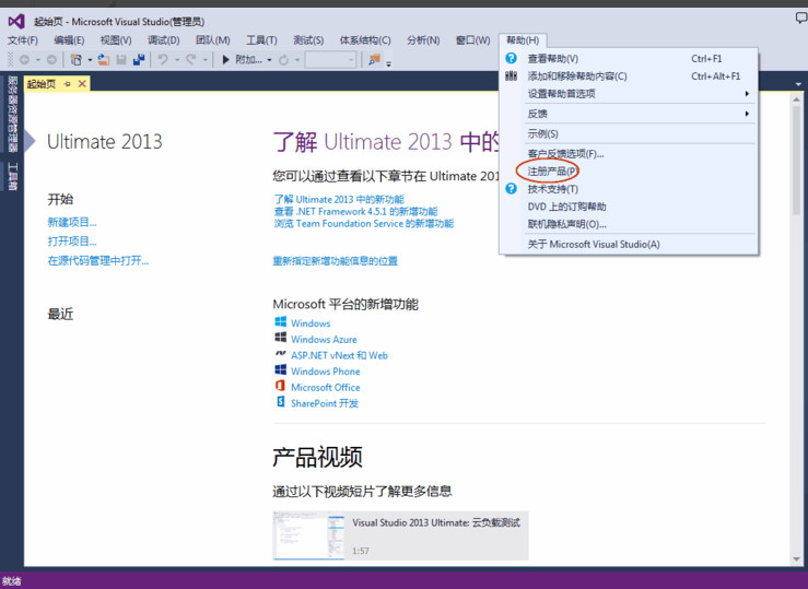 7、最后要給VS注冊一下,不然軟件是有30天的試用期。打開VS2013,在工具欄中找到幫助選項卡,點擊注冊產(chǎn)品,會彈出一個對話框,里面會顯示軟件的注冊狀態(tài)