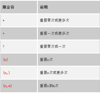 限定符又叫重復描述字符,表示一個字符要出現的次數。比如我們在匹配電話號碼時使用的{3,4}就表示出現3到4次。常用的限定符有