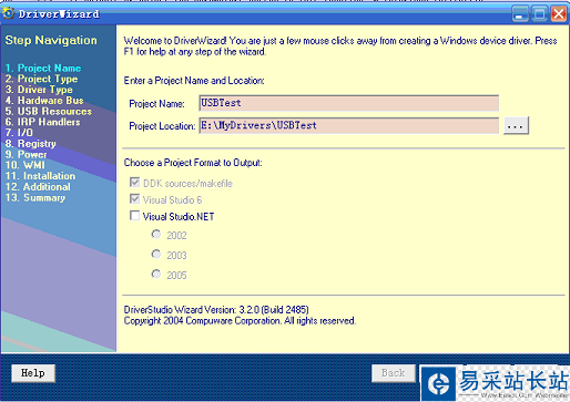 1、啟動VC,從VC IDE菜單"DriverStudio"中選擇"DriverWizard",如圖1所示對話框中,寫上項目名稱。在這里,我們將這個項目稱為:TEST,所在目錄為D:/TEST。然后點按鈕"Next>";