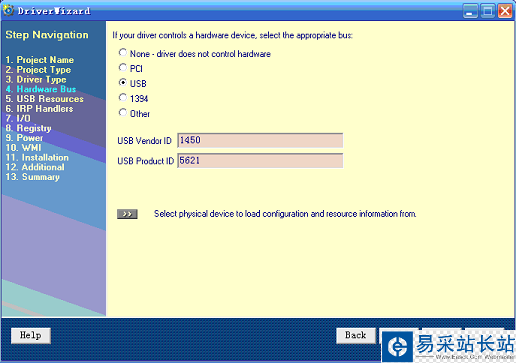 4、在第4個對話框中(如圖4),選擇我們驅動程序所操作總線類型。這里,我們選擇USB。在USB Vendor ID和USB Product ID中填入USB設備VID和PID。假定我們USB設備VID和PID分別是16進制0471和1801。然后點按鈕"Next >"。