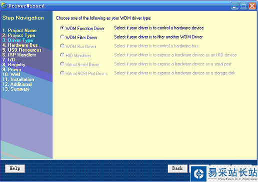 3、在接下來這個對話框中(如圖3),我們需要選擇驅動程序類型。由于USB設備驅動程序是WDM類型,所以我們選擇第二項并且點按鈕"Next >"。