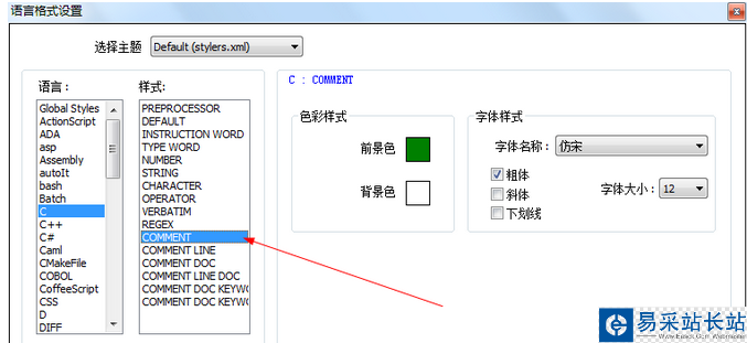 7、設(shè)置注釋字體格式。接著上一步驟,我們在“樣式”的那一欄中選擇“COMMENT”表明我們要對注釋字體進(jìn)行設(shè)置,具體操作情況如下圖所示