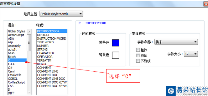 2、選擇“語言格式設(shè)置”后,系統(tǒng)會(huì)自動(dòng)彈出語言格式設(shè)置對話框。接下來我們選擇“C”表示我們將對.c格式的文件進(jìn)行設(shè)置,具體操作情況如下圖所示