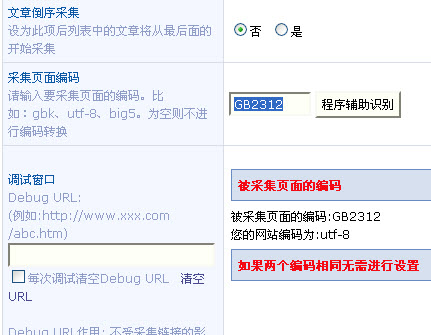 如果采集的頁面和網(wǎng)站的不一樣,需要填寫下編碼,你只需要點(diǎn)擊【程序輔助識(shí)別】,把識(shí)別出來的填寫到圖2的位置。