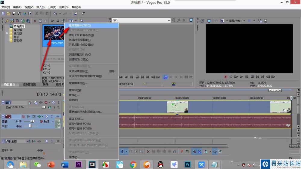 1、我們將項目媒體的素材鼠標右鍵——在修剪器中打開。