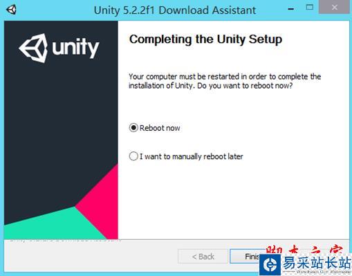 Unity安裝完成,系統提示需要立即重啟,筆者建議直接點擊“Finish”即可。(立即重啟電腦)