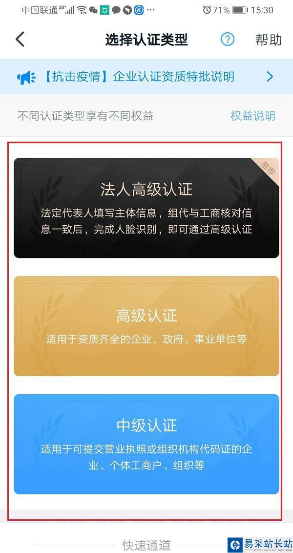 4、可以通過法人高級認證,高級認證,中級認證等,根據需要選擇方式認證企業,如下圖所示: