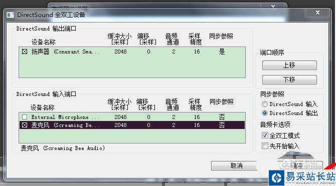 5、在“DirectSound輸入端口”的“設(shè)備名稱”中任意選擇一個,然后確定