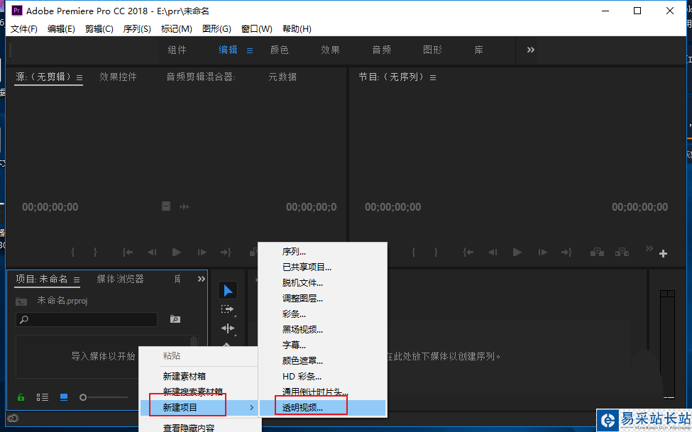2、在項目區域右擊鼠標,選擇新建-透明視頻。