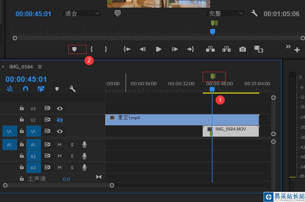 3、在星空素材上點擊眼睛圖標先隱藏該素材,播放手勢素材,在手勢素材上手勢開始和結束的地方分別做標記