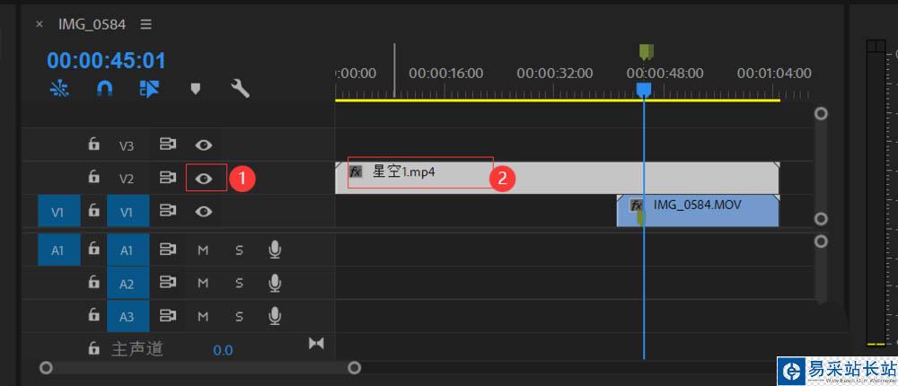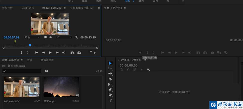 1、打開pr軟件,導入2段素材,實現手勢轉場到星空的效果