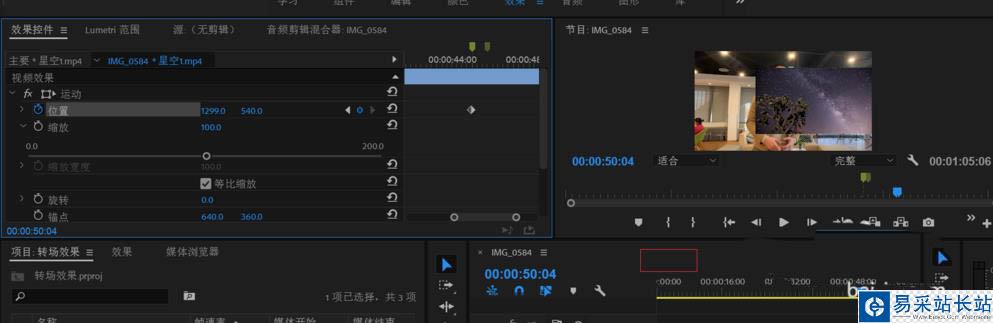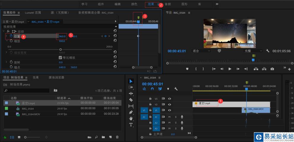5、設置效果,點擊星空素材①,然后點擊效果②,在效果運動位置那里點擊③處的標記,然后點擊位置前面的小秒表④,鼠標拉動調整⑤x軸的位置,直到把星空視頻拉到預覽窗口外面