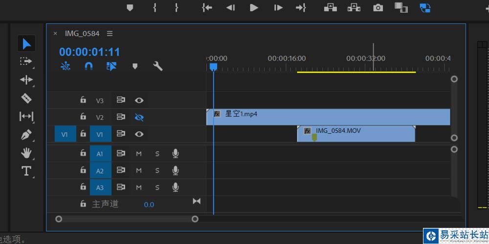 2、將2段素材拖動到時間線軌道上,星空效果在手勢素材的上層軌道上,并把手勢素材放到軌道的后半部分