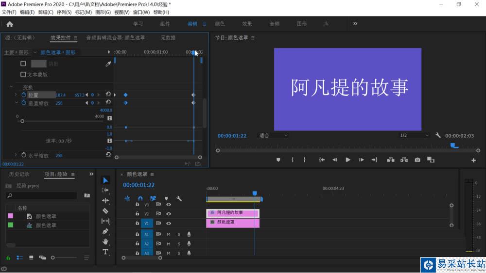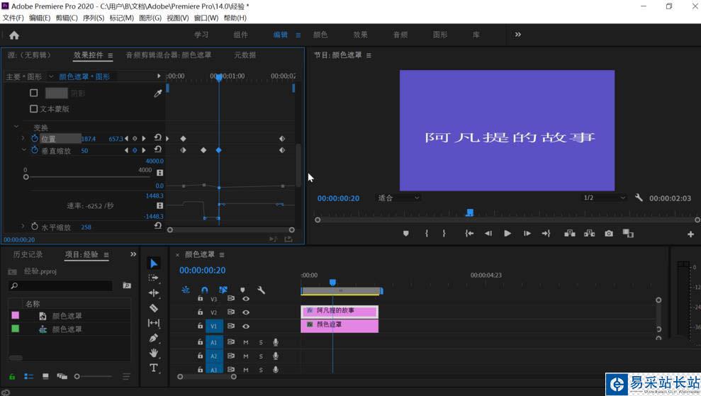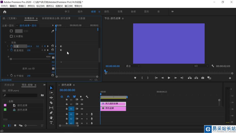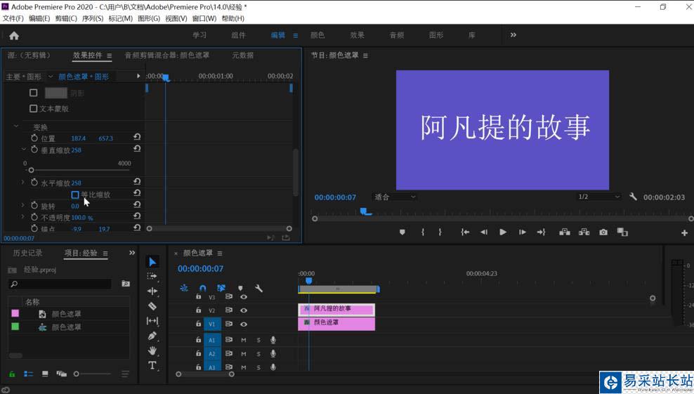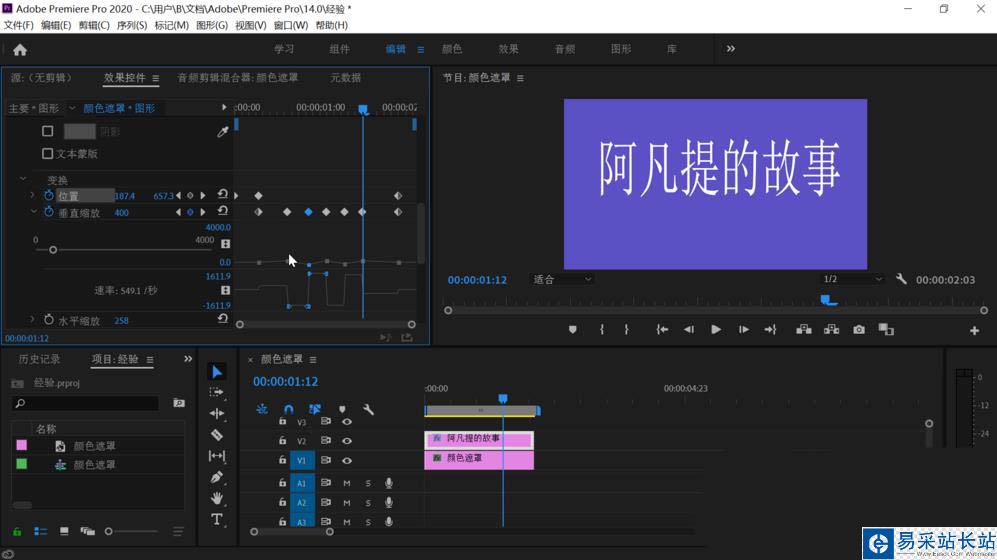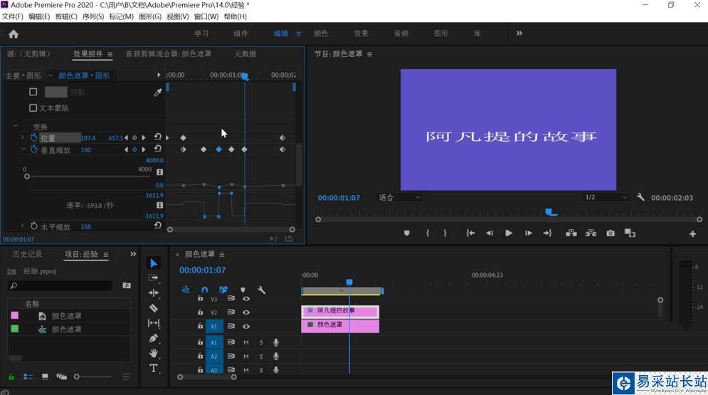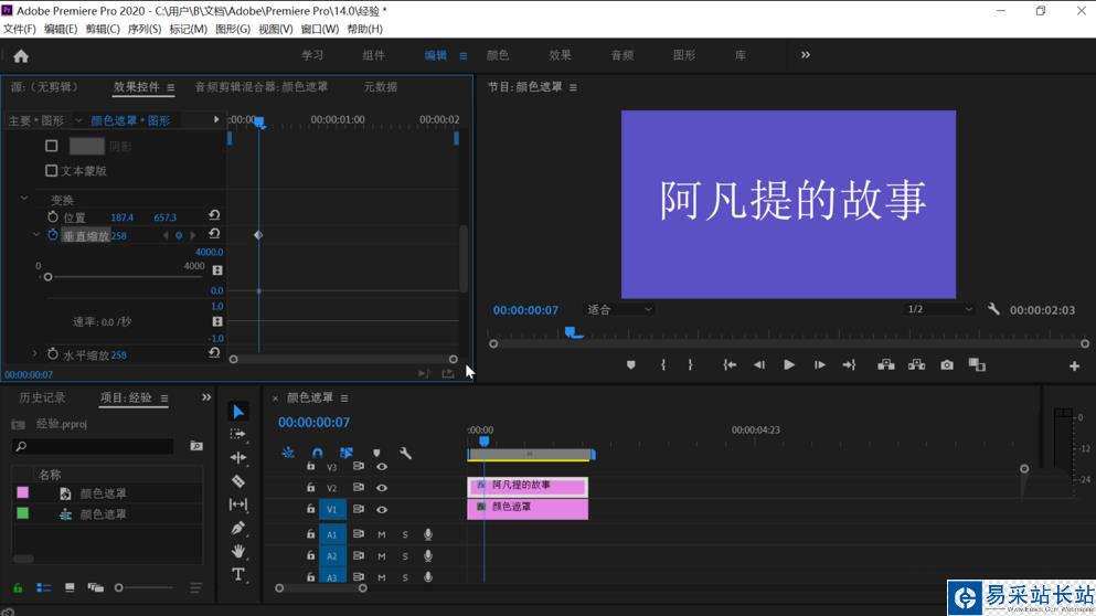 3、拖動時間軸上的文字圖形和下方的顏色遮罩時間一致后點擊上方工具欄上的編輯,鼠標(biāo)移動到左側(cè)的效果控件中,依次點擊“文字”,“變換”,把下方“等比縮放”前的勾點擊取消。之后拖動關(guān)鍵幀窗口的時間滑塊到左側(cè)開始處稍微有點距離的地方,點擊“垂直縮放”前的時鐘圖標(biāo)打開它的關(guān)鍵幀設(shè)置,可以看到已經(jīng)設(shè)置了一個關(guān)鍵幀。