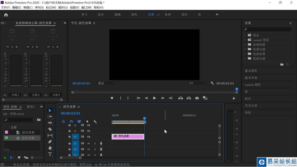 1、打開pr。新建一個淺藍(lán)色的顏色遮罩并拖入右側(cè)的時間軸上,拉動設(shè)置時間大約為2秒左右并放大時間軸。