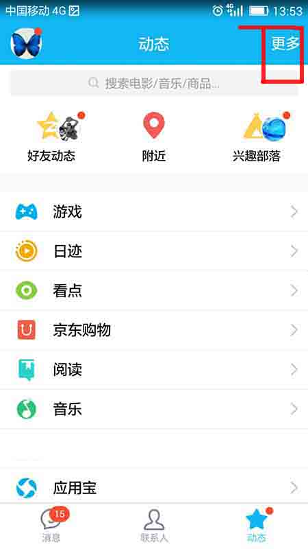 1、點(diǎn)擊進(jìn)入手機(jī)qq,找到右下角的“動(dòng)態(tài)”,點(diǎn)擊進(jìn)入,找到右上角的“更多”點(diǎn)擊,如下圖所示。