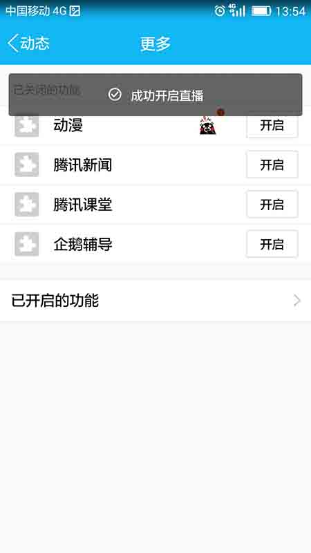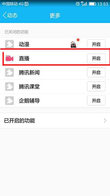 3、在“已開(kāi)啟的功能”中就可以找到“直播”,如下圖所示。