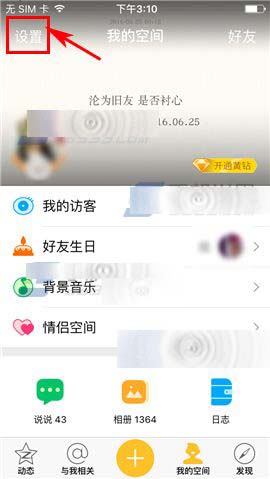 1)打開手機QQ空間,點擊右下角的【我的空間】,然后點擊左上角的【設(shè)置】;(如下圖)