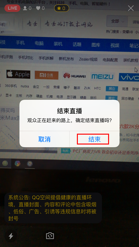 2、然后點(diǎn)擊之后會彈出一個對話框,問你是否確定結(jié)束直播,點(diǎn)擊【結(jié)束】按鈕,如圖所示。