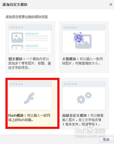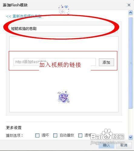 4.模塊的標題輸入你選擇的Flash動畫的標題或者隨意填寫.(不過是因為要顯示在你的空間主頁上的,所以還是美觀為主,不能太隨意哈.)下面的地址欄中是要添加你要的視頻的地址鏈接.