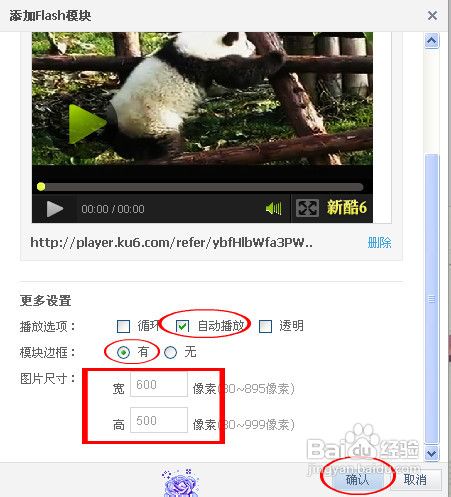 6.Flash動畫就添加進來了.然后按住下拉按鈕,下面有個更多設置,在更多設置里的播放選項里把自動播放勾起來,再在模塊邊框里選擇有,然后圖片尺寸大概在寬:600 高:500 像素左右,(寬要比高像素高一點.視頻播放起來比較美觀哦.)