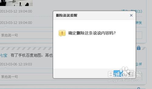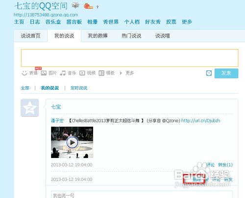 自己發表的說說才能刪除,我們點開后,在某一條說說的右下角,我們看到刪除,我們點“刪除”。