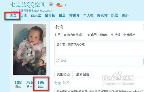 我們首先打開我們的QQ空間,首先點“主頁”,再在左上角,那邊顯示你有多少條說說,如圖,我們點開。