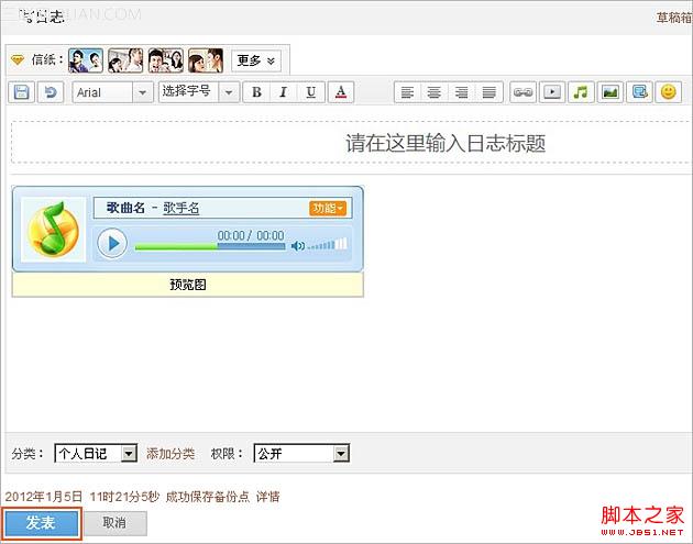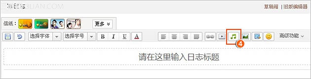 進入空間后在導(dǎo)航條上點擊‘我的主頁’選擇‘日志’,然后點擊‘寫日志’進入編輯頁面,選擇播放音樂的圖標;