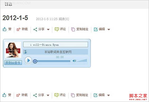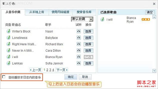 選擇好歌曲后,自動播放本日志內(nèi)的音樂前面查看打上勾,確定即可。(若您不想讓日志里音樂自動播放可以將方框里的勾去掉即可。)