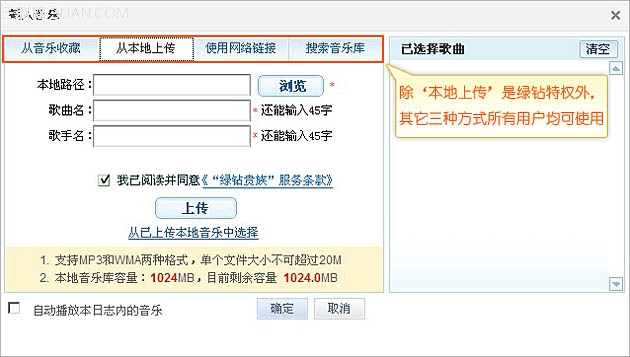 有四種方式選擇音樂:從音樂收藏、從本地上傳、使用網(wǎng)絡(luò)鏈接、搜索音樂庫。(本地上傳是綠鉆專用)