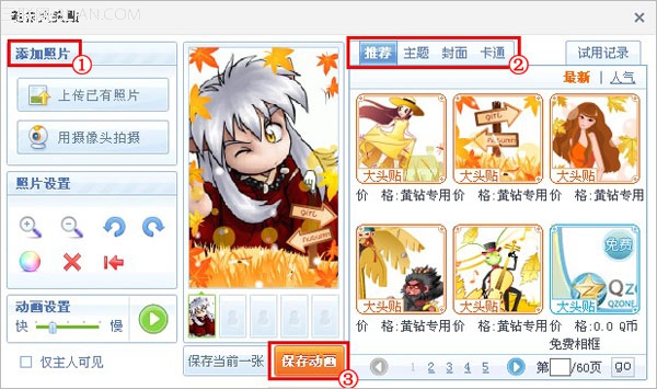2、您可以添加一張您喜歡的圖片,添加完后您可以從“主題、封面、卡通”中挑選您喜歡的照片相框,完成后,點擊“保存當前一張”或“保存動畫”;