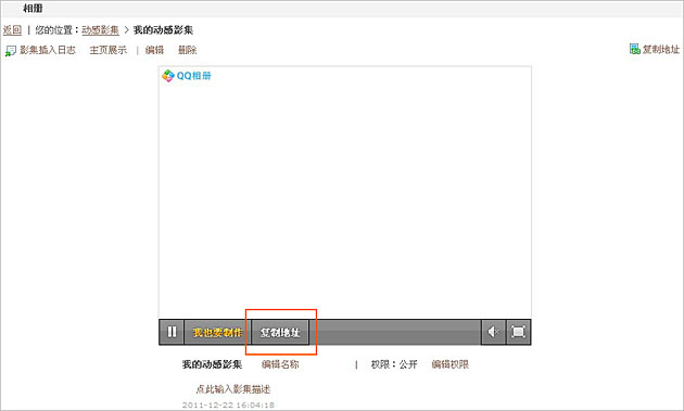 第二步:打開您的動感影集后,把鼠標移動到動感影集上,點擊影集下方出現的“復制地址”按鈕;
