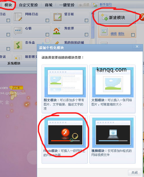在KANQQ空間flash模塊頻道找一個自己喜歡的Flash模塊