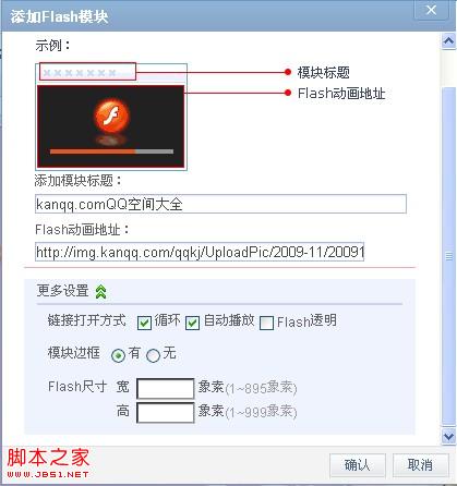 單擊“更多設置”會顯示其他的一些設置:FLASH尺寸高和寬根據你的摸板大小和FLASH文件大小調整;播放選項里:循環如果勾上則一直播放,不勾則只播放一次;自動播放一般勾選上;模塊背景、邊框,選無效果更佳。填好驗證碼,點“確定”。
