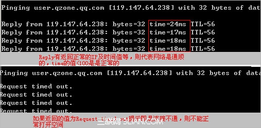 輸入Ping user.qzone.qq.com -t后,請留意數據返回的時間,一般Time在100ms以下基本都是能正常打開空間的,超過150ms以上就會比較慢了;