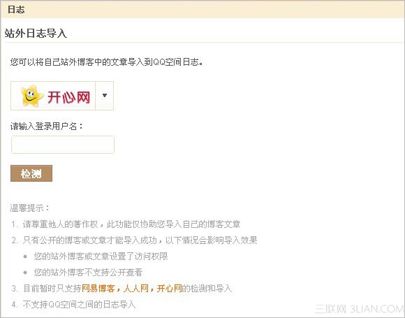 目前暫時只支持網(wǎng)易博客,人人網(wǎng),開心網(wǎng)的檢測和導入,但不支持QQ空間與QQ空間之間的互相導入。