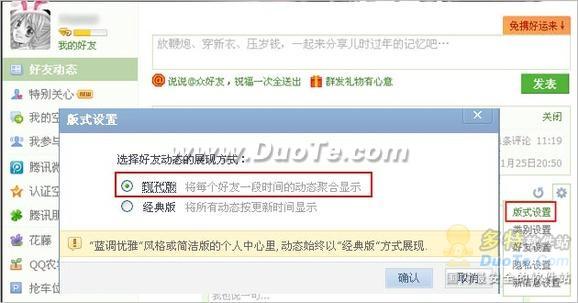 方式一:選擇“現(xiàn)代版”,將每個(gè)好友一段時(shí)間內(nèi)的動(dòng)態(tài)聚合在一起顯示;