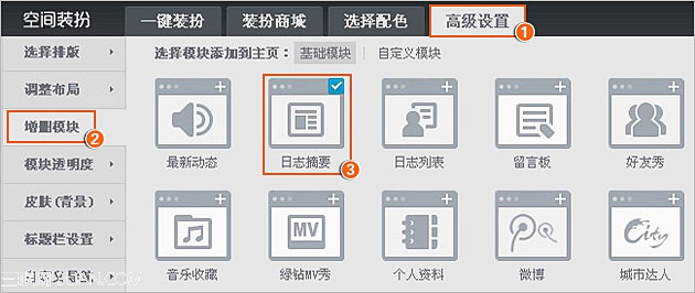 第二步:在“裝扮”之后找到“高級(jí)設(shè)置=》“增刪模塊”=》“日志摘要”模塊;