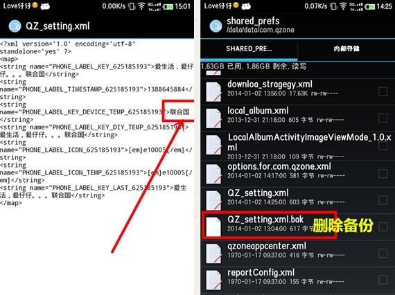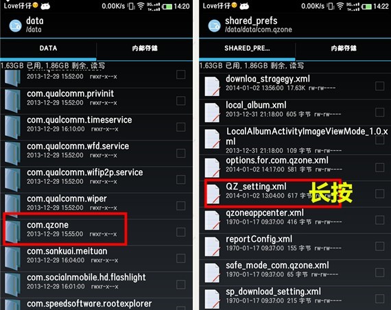 1.使用RE文件管理器,找到手機根目錄里依次找到/data/data/com.qzone/shaerd_prefs/QZ_setting.xml,找到該文件后,長按,然后選擇使用文本編輯器打開,如下圖所示: