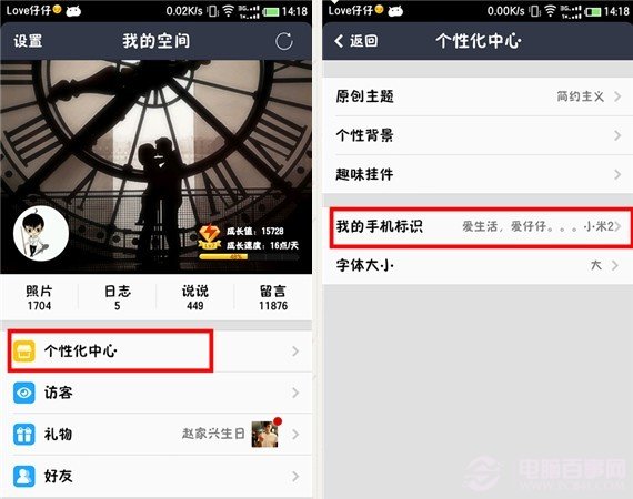 1、升級成功后,進入手機QQ空間,然后進入“個性化中心”,然后再進入“我的手機標識”設置,如下圖所示: