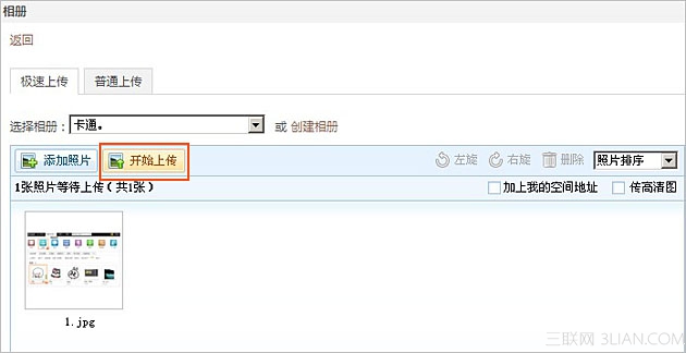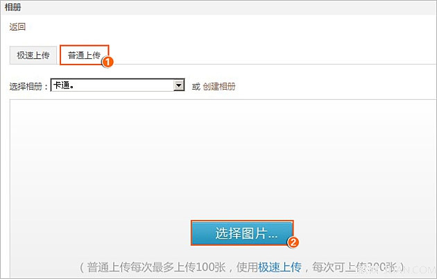 普通上傳:提供最基本的上傳功能,普通上傳每次最多上傳100張。