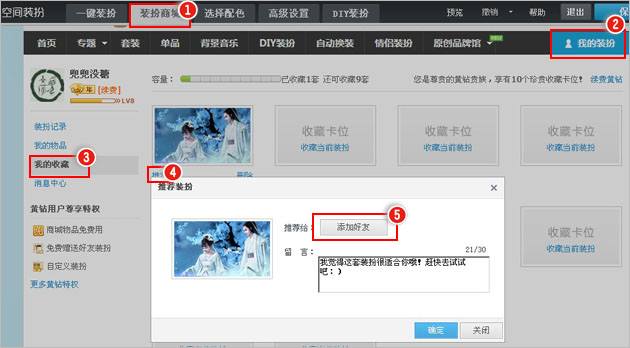 2、點擊“裝扮商城”后點擊右側“我的裝扮”,再點擊左側側邊欄中“我的收藏”后,選擇您要推薦的裝扮,點擊正文的“推薦”,在彈出的推薦裝扮的框中點擊“添加好友”,再將您要推薦的好友選擇便可完成。