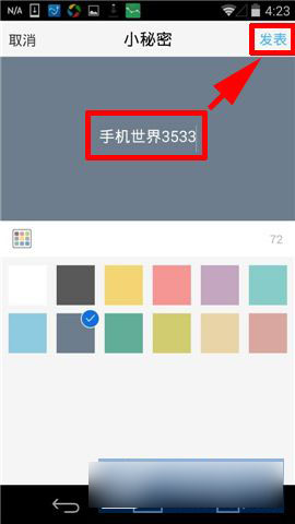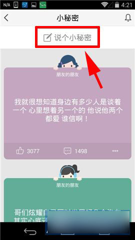 2)在這里,可以看到好友或者好友的好友發的匿名秘密,可以點擊查看回復以及進行回復。自己要發表秘密的話就點擊【說個小秘密】,然后輸入內容點擊【發表】即可。小編提醒:在秘密輸入框下方可以選擇自體顏色以及背景顏色。(如下圖)