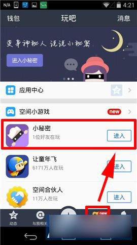 1)打開QQ空間,選擇下方【玩吧】欄,找到【小秘密】,點擊【進入】。(如下圖)