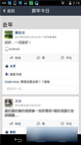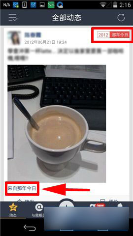 2)直到找到一條右上角標有【那年今天】紅色標志的動態,點擊該動態下方的【來自那年今天】,就可以進入那年今天頁面,里面可以查看到你的QQ好友們在往年的同一天發的動態,是不是很值得回味呢~(如下圖)