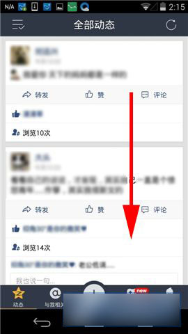 1)打開手機QQ空間,在動態欄一直往下拉。(如下圖)