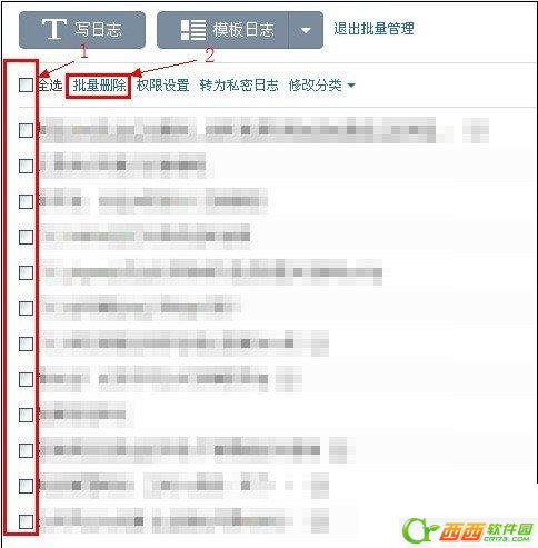 第三步:此時,每條日志的右邊會多出一個復選框,勾選要刪除日志前面的復選框或者勾選全選的復選框,再點擊【批量刪除】。
